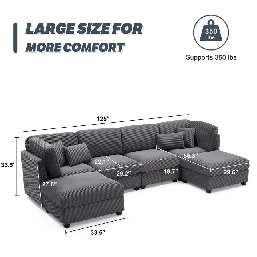 33.5. Four seats combine to create a 125 oversized modular sectional sofa. The large ottoman design allows for extra storage space